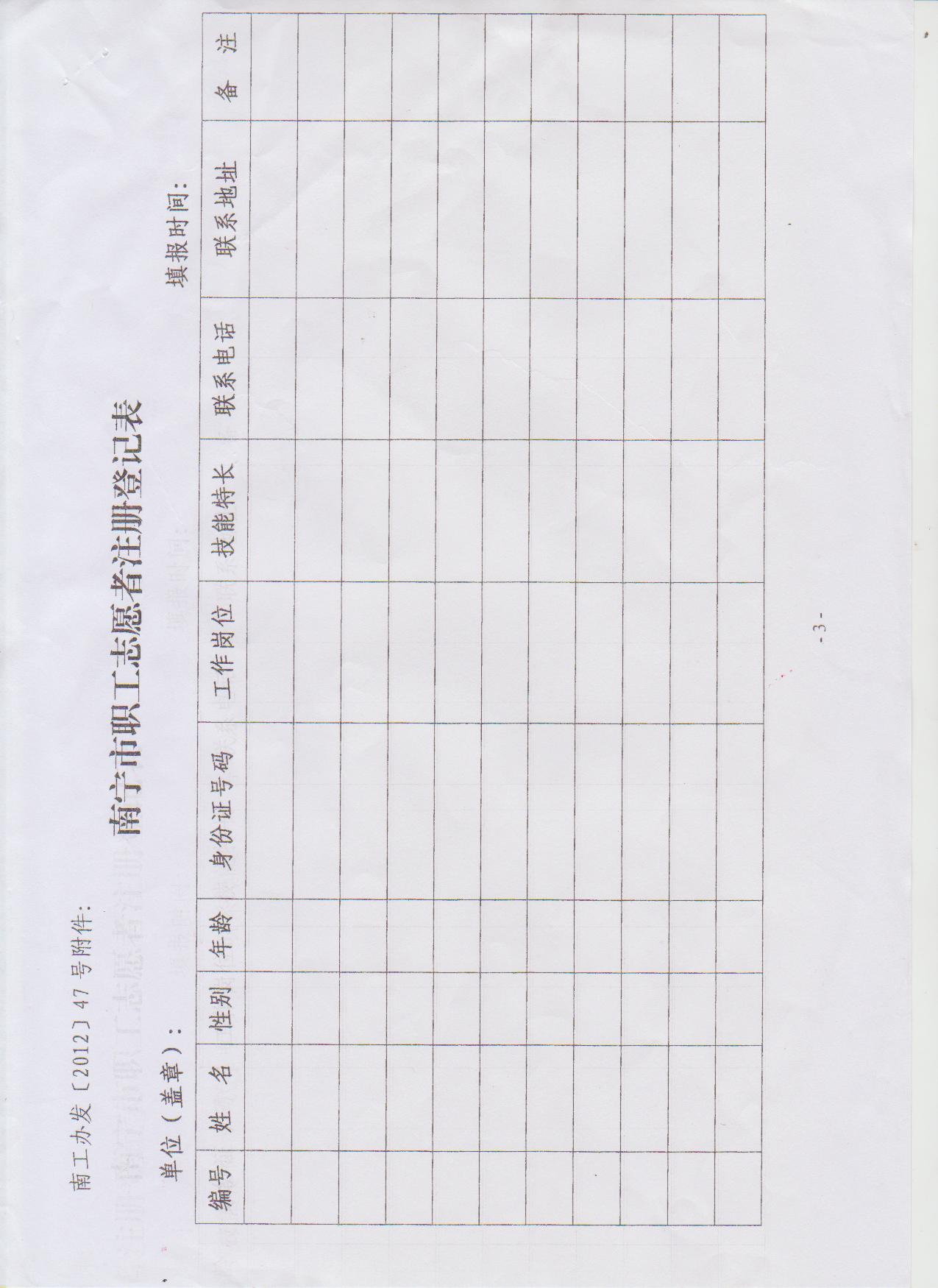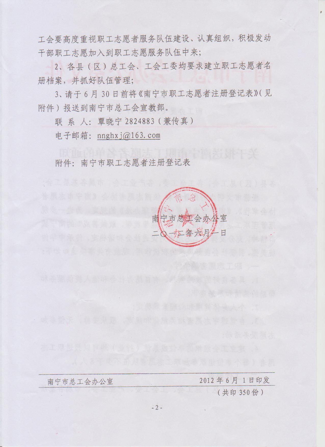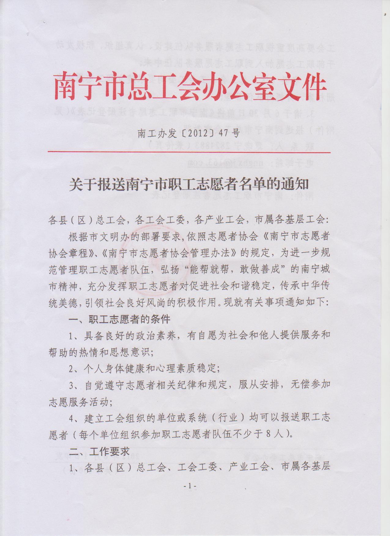 關(guān)于報送南寧市職工志愿者名單的通知(南工辦發(fā)[2012]47號)