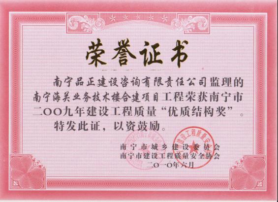 南寧品正負責(zé)監(jiān)理的金龍·理想1號5#、6#樓工程、中都·澳海藍灣工程12#、13#、15#樓工程、南寧海關(guān)業(yè)務(wù)技術(shù)樓合建項目、中華路高層職工住宅樓工程、南寧大商匯1#商業(yè)樓等多個工程榮獲南寧市城鄉(xiāng)建設(shè)委員會、南寧市建筑工程質(zhì)量安全協(xié)會頒發(fā)的南寧市建設(shè)工程“優(yōu)質(zhì)結(jié)構(gòu)獎”。