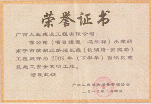 南寧品正負責監(jiān)理的廣西農科院職工住宅樓(科苑小區(qū))1、2、4、6、8#樓工程、南寧市濱湖北路延長線(長湖路-賢賓路)工程、半島·旺角1#、2#、3#、5#樓及商業(yè)裙樓工程等多個工程分別榮獲市建設委員會頒發(fā)的“南寧市建設工程施工現(xiàn)場安全文明工地”稱號。同時,南寧品正負責監(jiān)理的南寧-東盟經濟開發(fā)區(qū)D標排水主干系統(tǒng)17路段東干渠改造工程也獲得了北海市建設委員會、北海市建筑業(yè)聯(lián)合會共同頒發(fā)的“北海市建設工程安全文明工地”稱號。