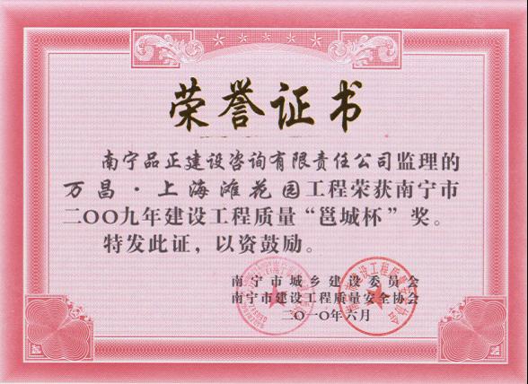 2010年6月,南寧品正負責(zé)監(jiān)理的南寧市南站南側(cè)路工程C標、E標、南寧市江南堤路園項目市政工程道路施工1#標、南寧市精品線路綜合整治工程(一期)B標、南寧市五象廣場周邊區(qū)域市政設(shè)施綜合整治工程I標工程、南寧市五象廣場周邊區(qū)域市政設(shè)施綜合整治工程I標、南梧大道工程(高速環(huán)二塘收費站到三塘下丹橋)NO.7標段、萬昌·上海灘花園工程、廣西明陽工業(yè)園啟動區(qū)道路工程III標等多個工程分別榮獲南寧市城鄉(xiāng)建設(shè)委員會、南寧市建設(shè)工程質(zhì)量安全協(xié)會頒發(fā)的南寧市2009年建設(shè)工程質(zhì)量“邕城杯”獎。