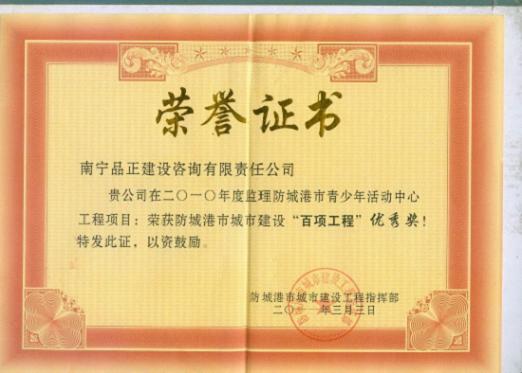 2011年3月3日,南寧品正負(fù)責(zé)監(jiān)理的防城港市青少年活動(dòng)中心工程榮獲防城港市城市建設(shè)工程指揮部授予的2010年度防城港市建設(shè)“百項(xiàng)工程”優(yōu)秀獎(jiǎng)。南寧品正將繼續(xù)踐行“科學(xué)規(guī)范、承諾守信、嚴(yán)格監(jiān)理”質(zhì)量方針,達(dá)到“履行監(jiān)理合同,提供滿(mǎn)意服務(wù)”的質(zhì)量目標(biāo)。