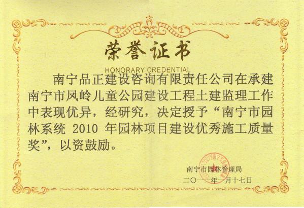 2011年1月17日,南寧品正負(fù)責(zé)監(jiān)理的南寧市鳳嶺兒童公園建設(shè)工程榮獲南寧市園林管理局頒發(fā)的“南寧市園林系統(tǒng)2010年園林項目建設(shè)優(yōu)秀施工質(zhì)量獎”。