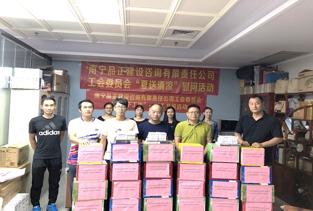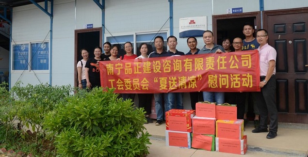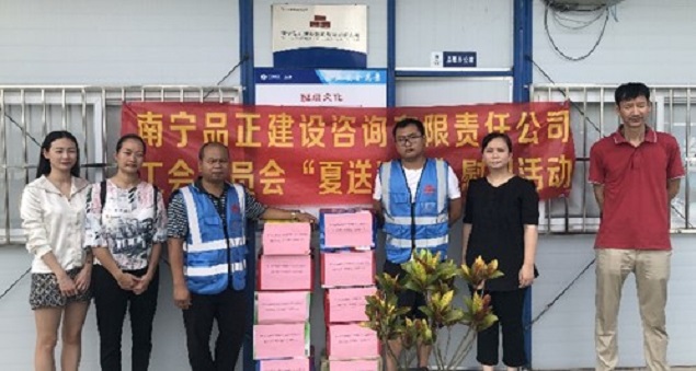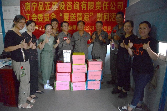 炎炎夏日,高溫持續(xù),大家都陷入了“蒸桑拿”的模式,環(huán)衛(wèi)工人、農(nóng)民工的艱辛受到了社會(huì)大眾的關(guān)注。有這么一群人,他們同樣不畏高溫,不怕酷暑,在“桑拿”的天氣下,依舊堅(jiān)守在崗位上,他們就是堅(jiān)守一線監(jiān)理崗位的員工。近日,由南寧品正建設(shè)咨詢有限責(zé)任公司工會(huì)委員會(huì)組織,公司總經(jīng)理羅順華、副總經(jīng)理蘇艷、工會(huì)主席梁秋霞以及工會(huì)委員組成的慰問小組深入基層項(xiàng)目,慰問頂著烈日、堅(jiān)守崗位的一線監(jiān)理員工,給他們送去絲絲涼意和滴滴關(guān)愛,讓他們?cè)谘籽紫娜罩懈惺艿焦竟?huì)“娘家人”對(duì)他們的關(guān)心。
