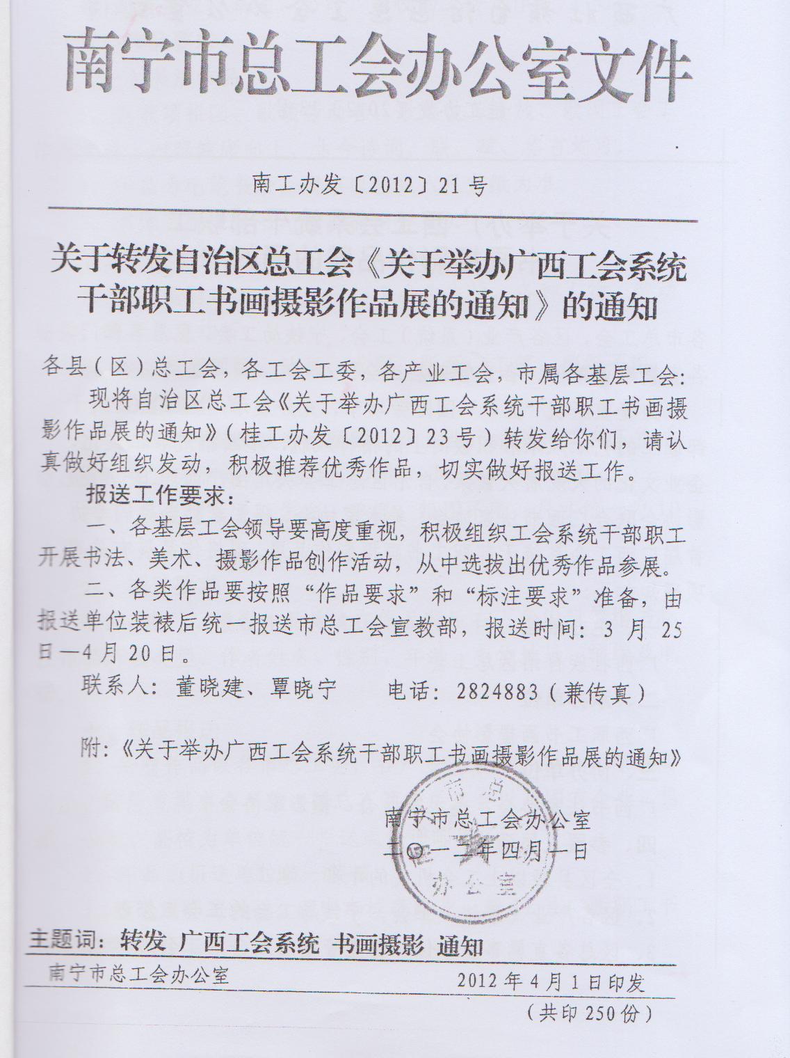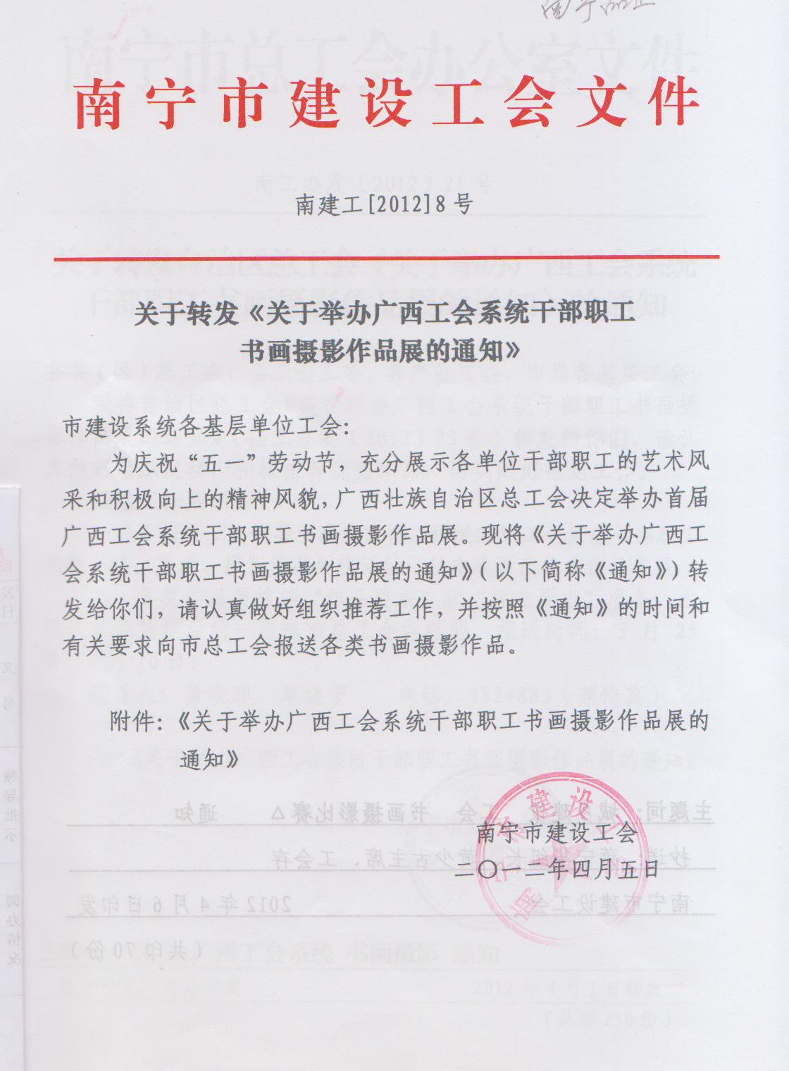 關(guān)于轉(zhuǎn)發(fā)《關(guān)于舉辦廣西工會(huì)系統(tǒng)干部職工書畫攝影作品展的通知》