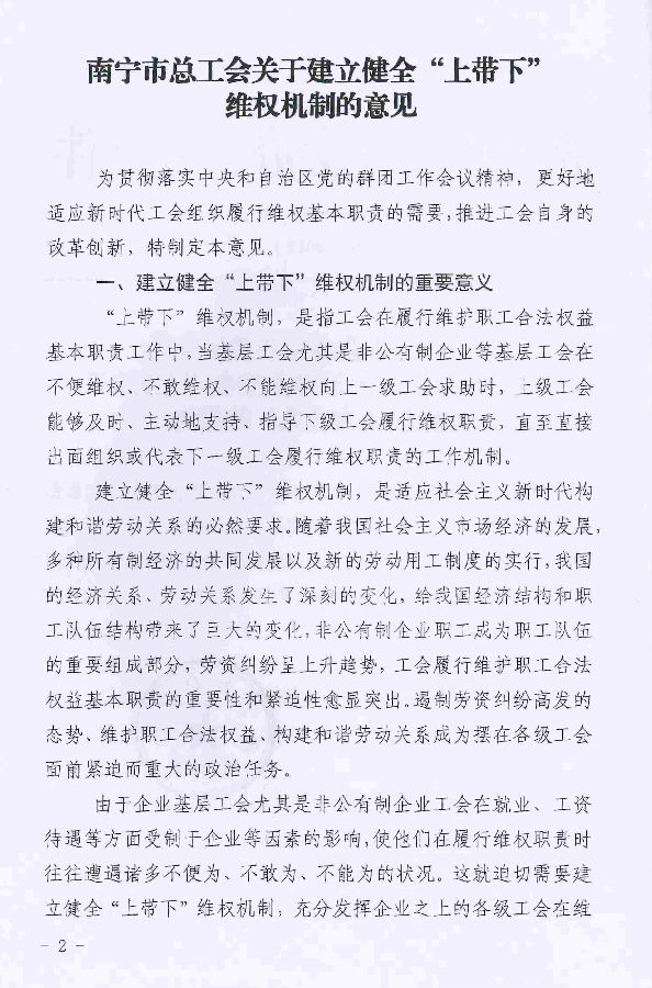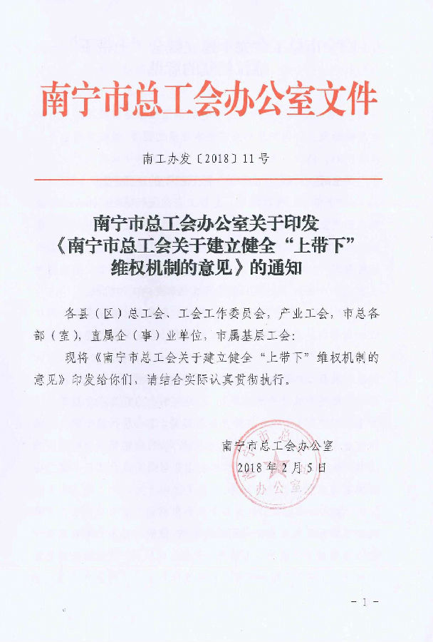 南寧市總工會辦公室關(guān)于印發(fā)《南寧市總工會關(guān)于建立健全“上帶下”維權(quán)機(jī)制的意見》的通知
