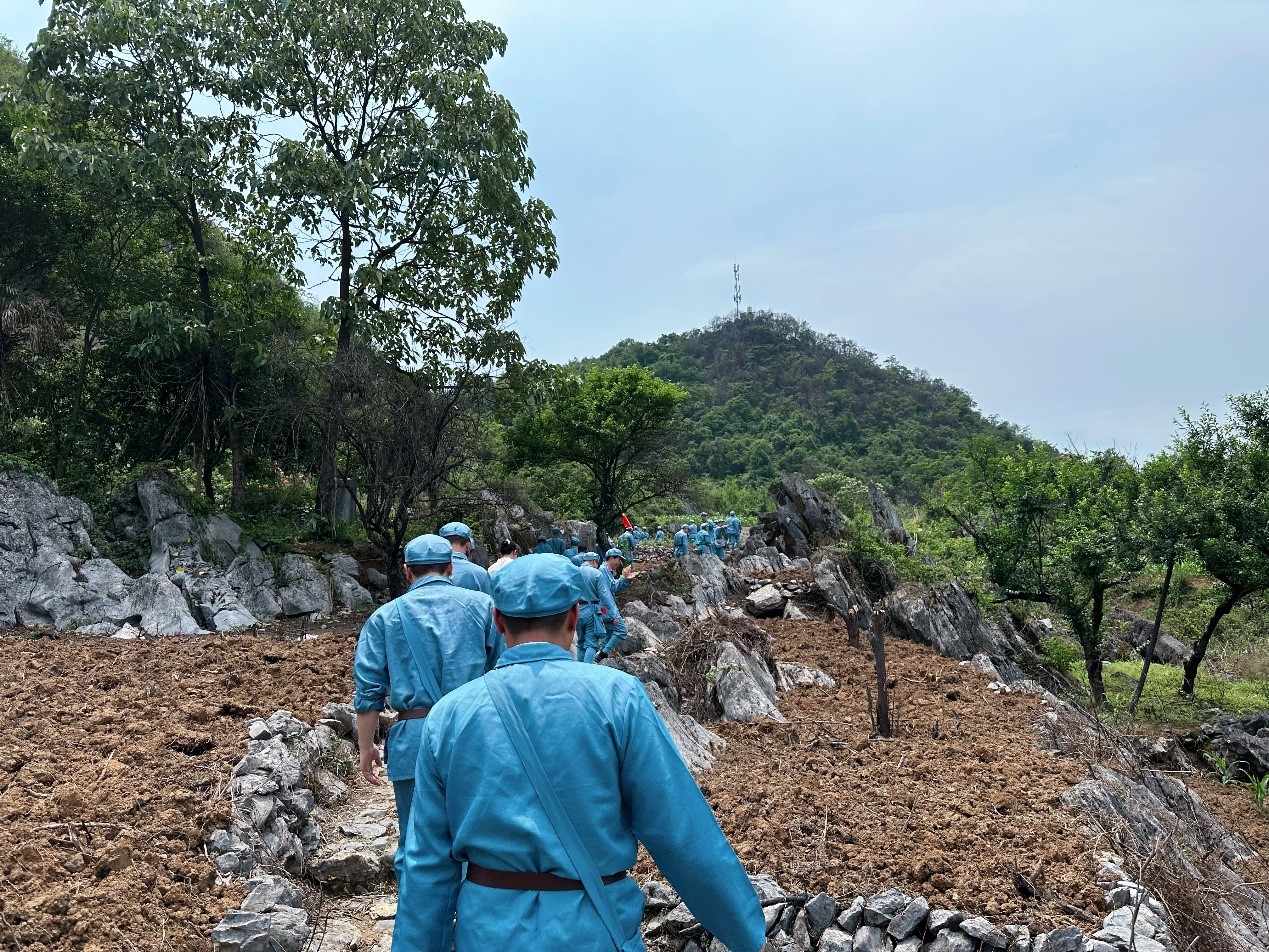 在灌陽參觀湘江戰(zhàn)役新圩阻擊戰(zhàn)酒海井紅軍紀(jì)念園,黨員同志們懷著無比沉重的和崇敬的心情,聆聽了當(dāng)年紅軍血灑湘江、氣壯山河的悲壯歷史。隨后廣大黨員干部,通過“穿一套紅軍服,走一段紅軍路”跟隨革命腳步,重走紅軍長征路,沿著革命先輩走過的崎嶇道路,一步一腳印,體會到了湘江戰(zhàn)役戰(zhàn)士的艱辛不易,一路追尋英雄將士們的紅色長征足跡,重溫那段難忘的歲月,在傳承紅色血脈的熏陶洗禮中,進一步傳承紅色基因,賡續(xù)紅色血脈。