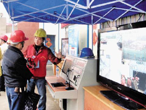 參觀者向工作人員了解“標(biāo)準(zhǔn)化”工地的現(xiàn)場(chǎng)監(jiān)控操作