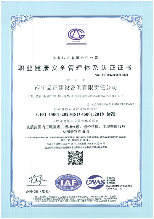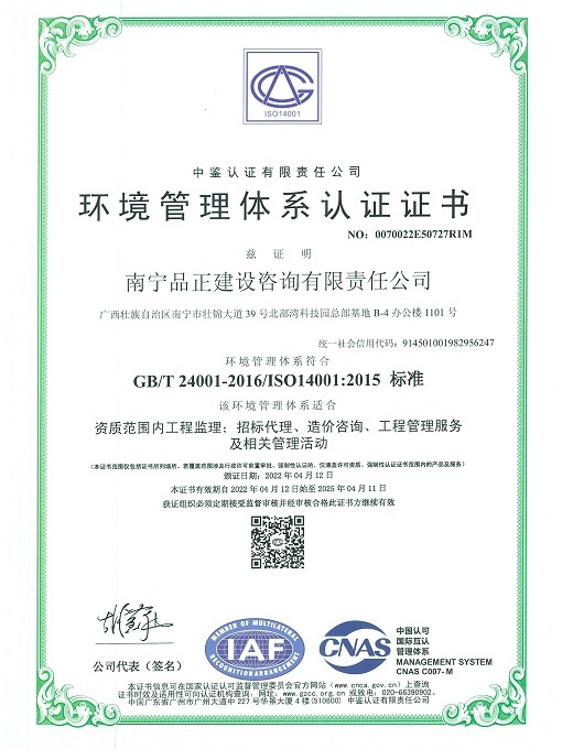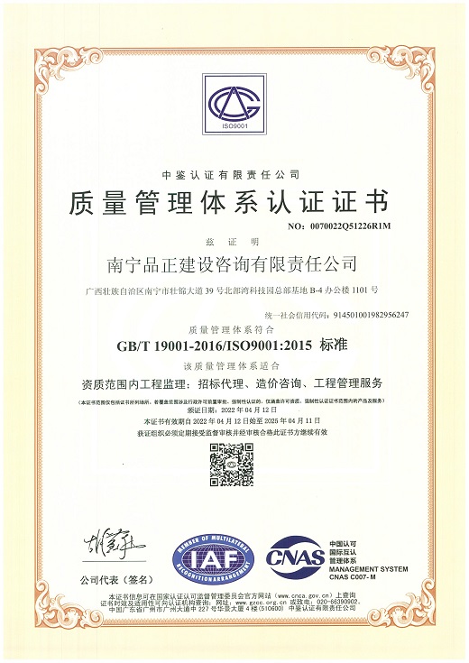 南寧品正于2000年通過(guò)ISO9001:2000質(zhì)量體系認(rèn)證,2009年改版為ISO9001:2008并通過(guò)認(rèn)證;2016年5月同時(shí)通過(guò)GB/T19001-2008質(zhì)量管理體系、GB/T28001-2001職業(yè)健康安全管理體系認(rèn)證和GB/T24001-2004環(huán)境管理體系三體系認(rèn)證。公司長(zhǎng)期重視管理體系認(rèn)證與實(shí)際工作的結(jié)合,制定行之有效的檢查及內(nèi)審程序文件,形成了完整的《管理手冊(cè)》、《程序文件》、《標(biāo)準(zhǔn)作業(yè)指導(dǎo)書(shū)》三個(gè)層次的質(zhì)量體系文件。每年定期進(jìn)行工作質(zhì)量檢查、質(zhì)量體系內(nèi)審和管理評(píng)審,確保公司整體質(zhì)量、環(huán)境和職業(yè)健康安全工作的有效性、持續(xù)性,達(dá)到規(guī)范化和標(biāo)準(zhǔn)化。